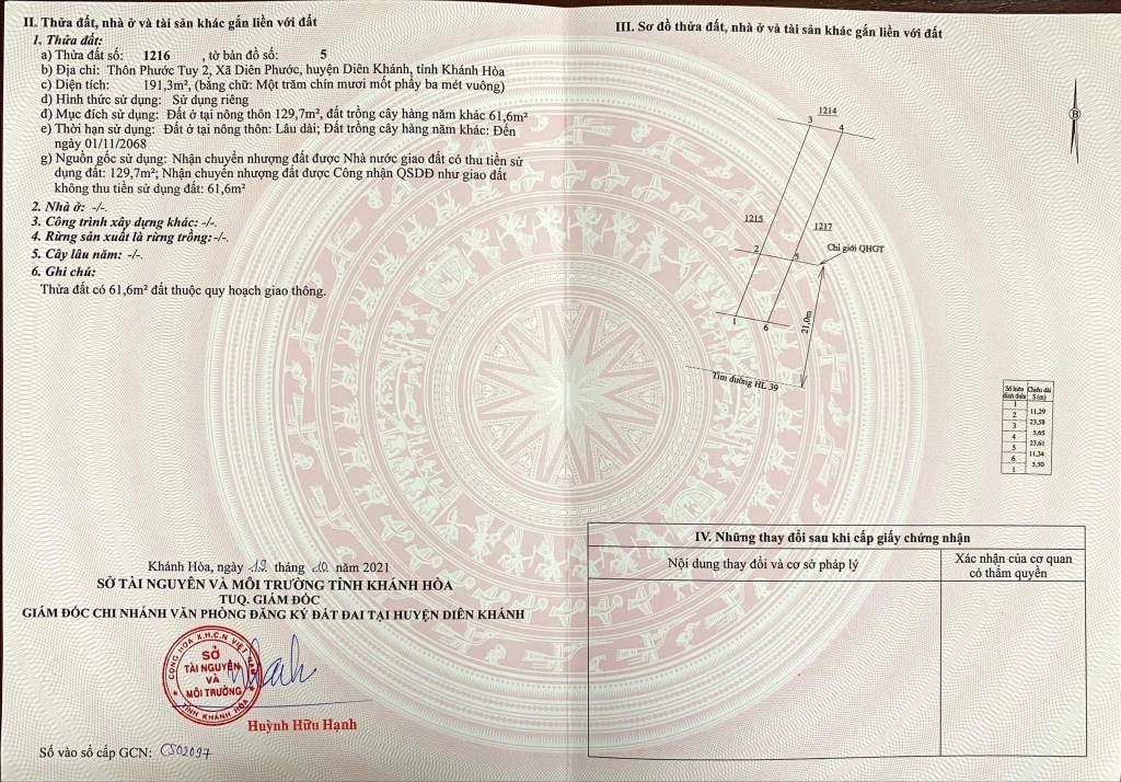 Diện tích 191,3m, ngang 5,5m, dài hơn 35m, có 129,7m thổ cư, hướng Tây Nam